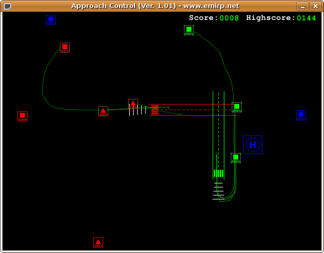 In Approach Control you handle incoming air traffic by drawing flight paths with the mouse. The game is based on the SDL library. To draw the flight paths the SDL_gfx library is used. There are Linux and Windows binaries to download.