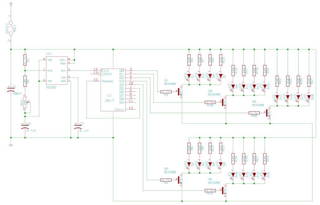 The circuit is based on the CD4017 decimal counter chip, which triggers one set of LEDs after the other via a transistor stage. The CD4017 is clocked by a NE555. The speed can be changed by the variable resistor. The circuit is powered by a 9V battery.